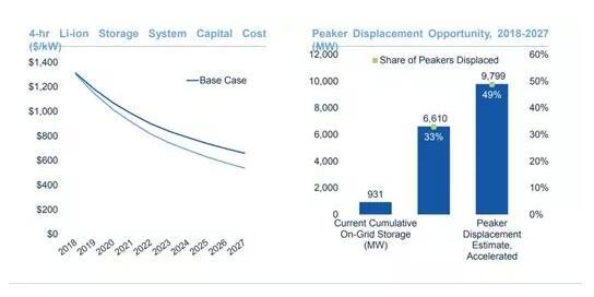 據(jù)上看,當前在某些領(lǐng)域鋰離子電池和天然氣峰值電廠之間是可以競爭的,未來幾年這種競爭在美國全國范圍內(nèi)會越來越明顯,隨著成本“瓶頸”的突破,電池在美國將更具優(yōu)勢。