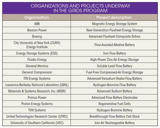 在實(shí)施持續(xù)增加電力儲(chǔ)能(DAYS)計(jì)劃之前,美國(guó)能源部高級(jí)能源研究計(jì)劃署(ARPA-E)為電網(wǎng)規(guī)??蓴U(kuò)展間歇可調(diào)度式儲(chǔ)能(GRIDS)設(shè)置了目標(biāo)。其目標(biāo)是開(kāi)發(fā)能夠存儲(chǔ)可再生能源的儲(chǔ)能技術(shù),可以在電網(wǎng)任何位置使用,投資成本低于每千瓦時(shí)100美元。這個(gè)靈活的大規(guī)模儲(chǔ)能系統(tǒng)將使可再生能源提供可靠的發(fā)電,從而創(chuàng)造更強(qiáng)大、更健壯的電網(wǎng)。下表列出了電網(wǎng)規(guī)??蓴U(kuò)展間歇可調(diào)度式儲(chǔ)能(GRIDS)計(jì)劃中的公司及其項(xiàng)目描述。