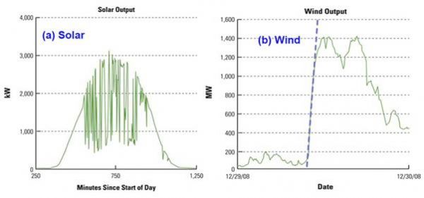 可再生能源發(fā)電源的一個(gè)重要特征是其可變性。圖1顯示了間歇性可再生能源(太陽(yáng)能和風(fēng)能)在幾分鐘到一小時(shí)的時(shí)間范圍發(fā)生的功率輸出的強(qiáng)烈變化,間歇性功率變化超過(guò)80%。電網(wǎng)功率電平偏差頻譜顯示發(fā)電和輸電調(diào)度功率電平之間的過(guò)多/欠缺的變化。