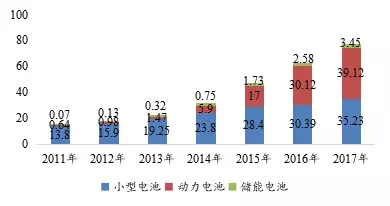 2011-2017年全球不同類型鋰電池出貨量(GWh)