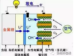 在放電時負極以鋰離子的形式溶于有機電解液,然后穿過固體電解質(zhì)遷移到正極的水性電解液中;電子通過導(dǎo)線傳輸?shù)秸龢O,空氣中的氧氣和水在微細化碳表面發(fā)生反應(yīng)后生成氫氧根,在正極的水性電解液中與鋰離子結(jié)合生成水溶性的氫氧化鋰。在充電時電子通過導(dǎo)線傳輸?shù)截摌O,鋰離子由正極的水性電解液穿過固體電解質(zhì)到達負極表面,在負極表面發(fā)生反應(yīng)生成金屬鋰;正極的氫氧根失去電子生成氧。