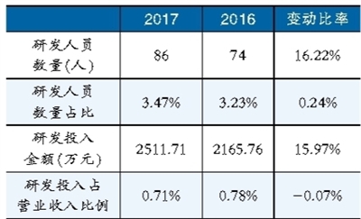 產(chǎn)能擴張的同時,滄州明珠的科研投入雖然也在增加,但是稍顯不足。2017年,其研發(fā)人員為86人,比上年同期的74人增長了16.22%(見表二);研發(fā)人員占企業(yè)員工的比率為3.47%,比上年同期的3.23%增加0.24個百分點;在研發(fā)投入上,雖然其絕對數(shù)額是增加的,由2016年的2165.76萬元增加到2017年的2511.71萬元;但是,其研發(fā)投入占營業(yè)收入的比例卻下降的,2017年比2016年下降了0.07個百分點。顯然,滄州明珠的研發(fā)投入增長與其營業(yè)收入的增長差距較大,這或?qū)⒉焕谄浜罄m(xù)的競爭力提升。