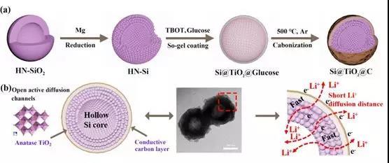 ▲圖1 Si@TiO2@C負極材料的(a)制備示意圖和(b)結(jié)構(gòu)示意圖