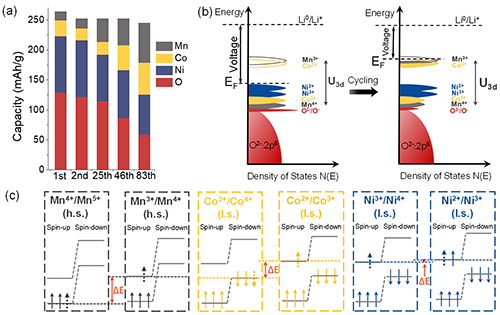 圖3 Li1.2Ni0.15Co0.1Mn0.55O2不同充放電周次的氧化還原反應(yīng)(a)不同元素在不同充放電周次對容量的貢獻;(b)電子結(jié)構(gòu)變化帶來的鋰離子儲存電勢的變化;(c)不同過渡金屬氧化還原電對能級差異與電壓衰減關(guān)聯(lián)。