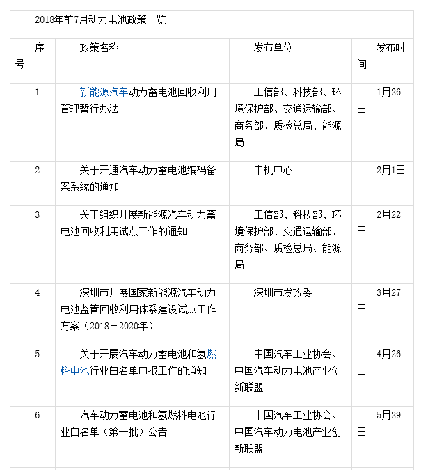 經電動汽車資源網統(tǒng)計,2018年前7月,國家及地方共發(fā)布動力電池方面的政策或標準10條,其中7條直接與動力電池回收利用有關,2條和動力電池白名單有關,1條和新建動力電池企業(yè)投資項目有關。