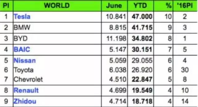 再來(lái)看車(chē)企排名,第一名當(dāng)然是特斯拉,因?yàn)閮煽钴?chē)的銷量都非常高。寶馬排名第二,半年銷量4.2萬(wàn)輛。而比亞迪排名第三,落后寶馬7千多輛。北汽新能源緊跟其后排名第四。前十名里還有一個(gè)自主品牌就是知豆。