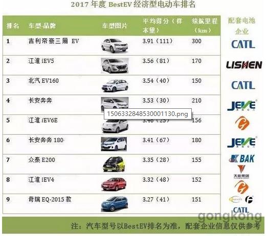 2017年最優(yōu)電動(dòng)汽車排名及上榜車型配套動(dòng)力電池公司