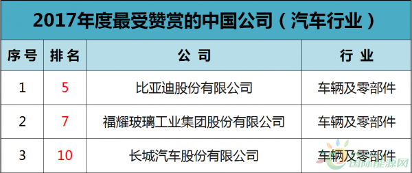 比亞迪、長城、上汽入榜2017年“最受贊賞的中國公司” 比亞迪居汽車榜榜首