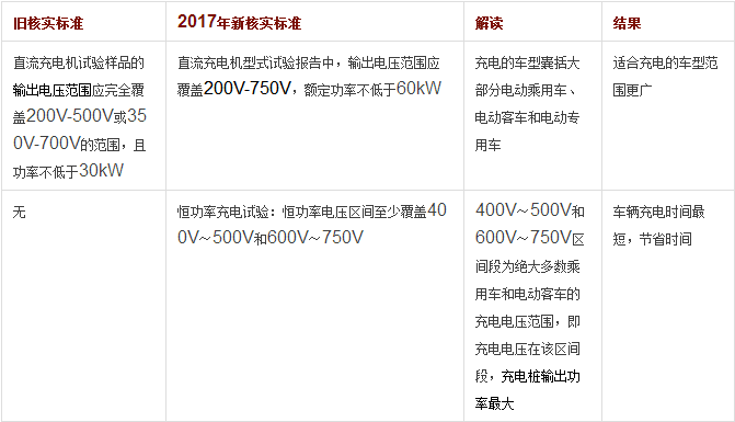2017版新的核實標準把直流充電機輸出電壓范圍由舊標準的200V-500V或350V-700V改為200V-750V,且功率不低于30kW改為額定功率不低于60kW,這樣適于充電的車型范圍更廣,最終實現(xiàn)所有的電動車型都可以充電。