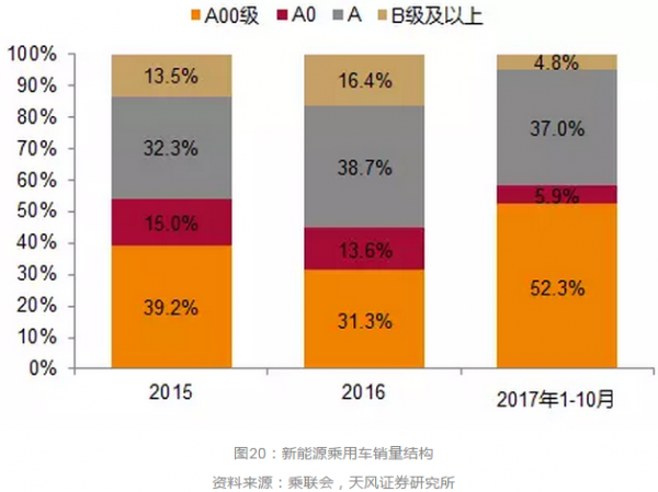詳細(xì)拆分近三年新能源乘用車銷量數(shù)據(jù)我們會(huì)發(fā)現(xiàn),A00級(jí)小車銷量占比極高,今年前十個(gè)月,A00級(jí)小車銷量占比超過(guò)50%。而包含燃油車在內(nèi)的乘用車總銷量結(jié)構(gòu)中,占比最高的為A級(jí)車,約60%,A00級(jí)車占比不足2%。對(duì)比之下不難發(fā)現(xiàn),現(xiàn)有新能源乘用車銷量結(jié)構(gòu)十分不合理。在補(bǔ)貼政策引導(dǎo)和主流車企發(fā)力的雙重作用下,未來(lái)新能源汽車市場(chǎng)結(jié)構(gòu)將與傳統(tǒng)燃油車銷量結(jié)構(gòu)趨同。