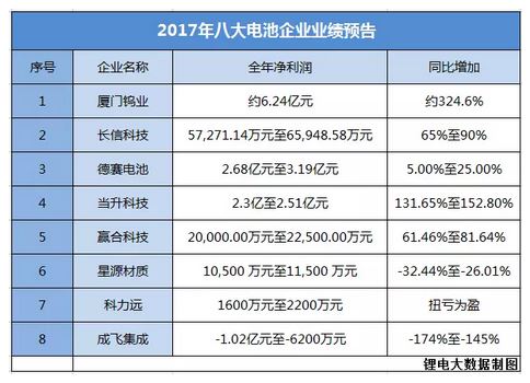 2017年度8家鋰電相關(guān)企業(yè)業(yè)績預(yù)告大盤點(diǎn)