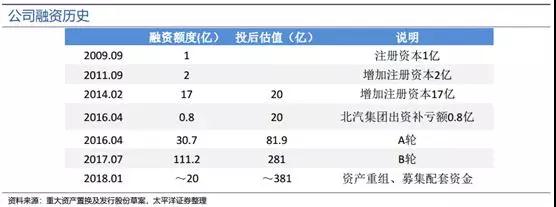 據(jù)了解,成立于2009年的北汽新能源發(fā)展迅猛,是連續(xù)五年的純電動汽車銷量龍頭。其中,2015-2017年北汽新能源銷量實現(xiàn)每年翻番,比如2017年其純電動銷量達到10.3萬臺,同比增長98%。與市場優(yōu)異表現(xiàn)相對應(yīng)的是,公司估值火箭般躥升,如下圖所示:
