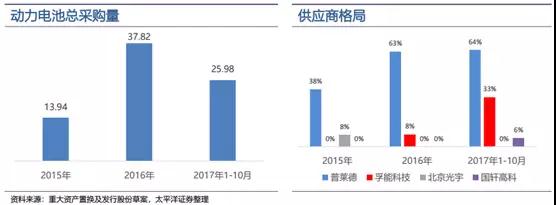 在采購新能源汽車核心零部件動力電池方面,目前北汽新能源有四大供應(yīng)商,其中普萊德(主要CATL電芯的PACK商)的份額比較穩(wěn)定,孚能科技的供應(yīng)量快速增長,國軒高科2017年取得突破性進展。太平洋證券數(shù)據(jù)顯示,2017年1-10月北汽新能源采購動力電池26億元,占總營業(yè)成本比例的41%。具體如下圖所示: