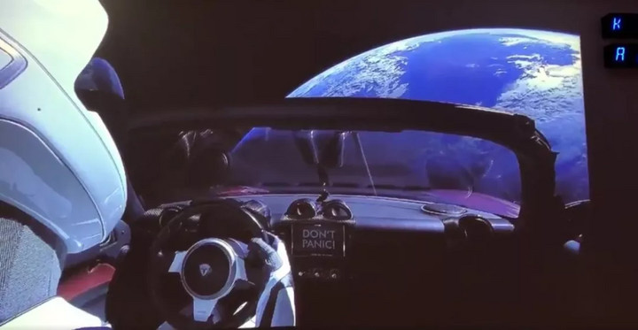 啊對(duì)了,最后一件小事,在今天發(fā)射出去的火箭上,Musk 的那臺(tái)紅色 Roadster 跑車,在里面坐了一個(gè)叫 Starman 的太空駕駛員,汽車儀表盤上寫了 2 個(gè)大字:Don’t Panic ,然后據(jù)說(shuō)車?yán)镞€放著一本
