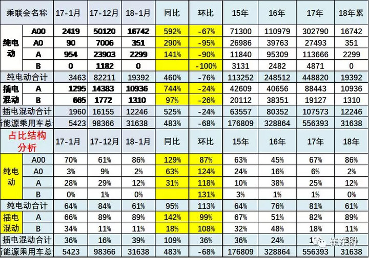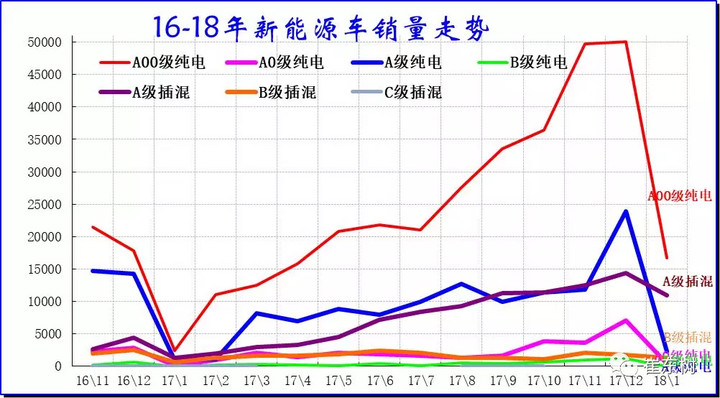 由于預(yù)期的2018年實施雙積分政策延期到2019年實施,這對新能源車企的發(fā)展是較大的沖擊,不利于企業(yè)規(guī)劃落實。因此18年是政策推動向市場拉動的新舊增長動能轉(zhuǎn)換期,車市增長壓力較大,對18年新能源車增長不應(yīng)太樂觀。1月的高增長有2月末的北京市場的6萬臺號牌支持,也有非限購區(qū)域的私人購買的啟動。1月的A00級純電動車的占比達(dá)到86%,這也是預(yù)期微型短續(xù)航里程車型的補(bǔ)貼調(diào)整和過渡期相對較高補(bǔ)貼的體現(xiàn)。