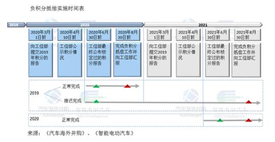 根據(jù)雙積分政策的實施時間表,雖然該政策的生效時間是2018年4月1日,但因為政策要求從2019年度開始才設(shè)定新能源汽車的積分比例要求(10%)。而正常情況下,積分考核又是建立在上一年積分核算統(tǒng)計的基礎(chǔ)上進(jìn)行的,因此,對于2019年的新能源積分考核,實際要等到2020年的6月30日工信部等五部門聯(lián)合發(fā)布經(jīng)核實的2019年積分核算情況報告后才開始。2019年積分核算情況報告發(fā)布后的60天內(nèi),有負(fù)積分的企業(yè)就需要完成積分的交易了。