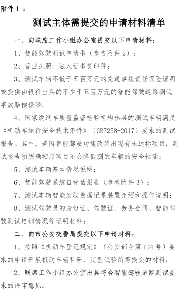 5、測(cè)試主體應(yīng)按要求提供申請(qǐng)材料(參考附件1、附件2和附件3),并對(duì)所提交材料的真實(shí)性、合法性負(fù)責(zé)。同時(shí),相應(yīng)測(cè)試車輛、測(cè)試駕駛?cè)藨?yīng)達(dá)到測(cè)試基本要求。
