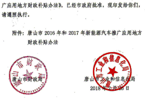唐山市財政局關(guān)于印發(fā)《2016年和2017年新能源汽車推廣應(yīng)用地方財政補貼辦法》的通知