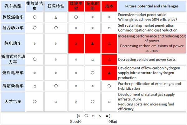 下表列出了傳統(tǒng)汽油車、HEV、PHEV、EV、燃料電池車FCV 、天然氣汽車等的一些優(yōu)缺點(diǎn),其中,EV在續(xù)駛里程、充電時(shí)間、成本三個(gè)方面的劣勢(shì)再目前還是大家比較關(guān)注的,PHEV、FCV在成本上也是面臨挑戰(zhàn)。