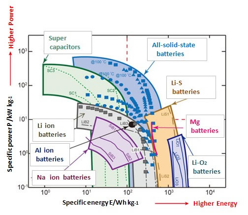 下圖對(duì)比了幾種類型電池的能量、功率密度特性。從圖中可以看到,全固態(tài)電池在能量和功率特性上超過(guò)了如今的鋰離子電池。在能量特性方面稍遜于鋰硫電池、鎂離子電池和鋰空氣電池等新型電池?;仡櫣虘B(tài)電解質(zhì)的研究歷史,多種電解質(zhì)材料都得到了廣泛的研究。在2011-2016期間,東京工業(yè)大學(xué)的Ryoji Kanno教授發(fā)現(xiàn)了鋰、鍺、磷、硫基超離子導(dǎo)體,它們作為固態(tài)電解質(zhì) 的離子導(dǎo)電率都超過(guò)液態(tài)電解液。2016年, Ryoji Kanno和豐田汽車的Yuki Kato博士等報(bào)道了新的超離子導(dǎo)體,實(shí)驗(yàn)室的研究數(shù)據(jù)顯示:其中一種Li9.54Si1.74P1.44S11.7Cl0.3材料的離子導(dǎo)電率高達(dá)25mS/cm,另一種Li9.6P3S12材料也顯示出較高的電化學(xué)穩(wěn)定性(∼0V vs.鋰),試驗(yàn)電池的工作溫度范圍很寬,在-30~100攝氏度之間,功率特性優(yōu)于液態(tài)電解液的電池,快充性能極好,達(dá)到18C,循環(huán)壽命在500次容量保持率為75%。當(dāng)然,這些實(shí)驗(yàn)室的研究成果還需要投入很多進(jìn)一步的研究才能達(dá)到產(chǎn)業(yè)化的階段。