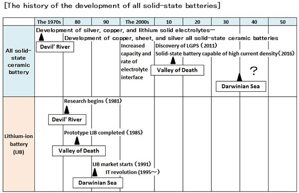 下圖概括了鋰離子電池跨越上述三個(gè)階段的時(shí)間,同時(shí)也對(duì)全固態(tài)電池的階段進(jìn)行了預(yù)測(cè)。全固態(tài)電池的研究可以追溯到19世紀(jì)70年代,如今經(jīng)過(guò)40多年了,一些新的超離子導(dǎo)體逐步被發(fā)現(xiàn),這使得固態(tài)電池有機(jī)會(huì)逐漸從研究階段向產(chǎn)品開(kāi)發(fā)階段推進(jìn)變得有可能,這就可以看作是跨越了魔鬼之河。當(dāng)很多人問(wèn)到全固態(tài)電池什么時(shí)候可以實(shí)現(xiàn)商業(yè)化這個(gè)問(wèn)題時(shí),或許用這句話可以概括:它還需要穿越“死亡之谷”和“達(dá)爾文海”。正如如今的鋰離子電池也是經(jīng)過(guò)十多年才跨越三個(gè)階段,而全固態(tài)電池或許還有更長(zhǎng)的路要走完剩下的兩個(gè)階段,或許還需要10-20年?