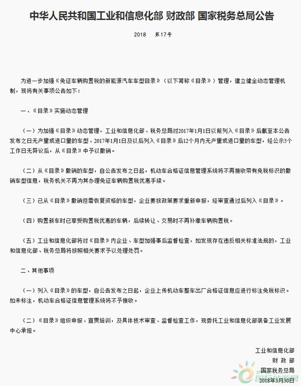 日前,工業(yè)和信息化部、財(cái)政部和國(guó)家稅務(wù)總局聯(lián)合發(fā)布公告,表示將進(jìn)一步加強(qiáng)對(duì)《免征車(chē)輛購(gòu)置稅的新能源汽車(chē)車(chē)型目錄》(以下簡(jiǎn)稱(chēng)《目錄》)的管理,建立健全動(dòng)態(tài)管理機(jī)制。