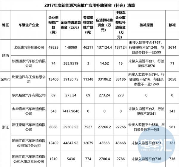 事實(shí)上,據(jù)電車(chē)匯調(diào)研,2016年新能源企業(yè)申報(bào)推廣數(shù)為51016輛,企業(yè)申請(qǐng)清單資金為124.63億元,最終專(zhuān)家組核定推廣數(shù)為50208輛,核減808輛不符合補(bǔ)貼要求的車(chē)型,2016年第三批應(yīng)清算補(bǔ)助資金為123.33億元。2017年新能源汽車(chē)企業(yè)申報(bào)推廣數(shù)為230616輛,申請(qǐng)清算資金為96.01億元,最終專(zhuān)家組核定的推廣數(shù)為161667輛,核減68949輛不符合補(bǔ)貼要求的車(chē)型,應(yīng)清算補(bǔ)助資金為66.41億元。