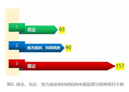 從項目數(shù)量和投資金額來看,國企是能源互聯(lián)網(wǎng)中項目的主力。國企申報項目數(shù)量為157家,金額為1976.21億元,占總金額的56%;民企申報項目數(shù)量為83家,金額為897.81億元,占比21%。其余包括地方政府、科研機構(gòu)等進(jìn)行的項目申報,占比為23%。