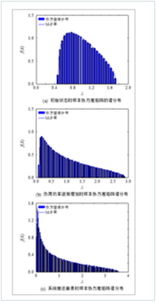 式中,a=σ2(1−c√)2a=σ2(1−c)2,b=σ2(1+c√)2b=σ2(1+c)2這里c為維數(shù)與樣本量的比值,σ2σ2為刻度參數(shù),σ2=1σ2=1。通過(guò)對(duì)連續(xù)潮流輸入數(shù)據(jù)預(yù)處理后,應(yīng)用實(shí)時(shí)分離窗技術(shù),選取不同狀態(tài)可以看出樣本協(xié)方差譜分布直方圖和M-P率曲線如圖1所示。