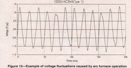 電壓波動:波動幅值不超過10%的周期性電壓變動。通常,這個變化值遠小于大部分電氣設備敏感限制,因此只在少數(shù)情況下才會發(fā)生運行上的問題。引起電壓波動的主要原因是功率沖擊性波動負荷。(下圖為電弧爐引起電壓波動)
