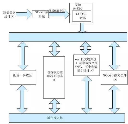 設(shè)備根據(jù)預(yù)設(shè)的配置、參數(shù),實現(xiàn)應(yīng)用功能,由此而產(chǎn)生的設(shè)備狀態(tài)及輸入狀態(tài)的標志等置入“設(shè)備狀態(tài)監(jiān)測狀態(tài)標志區(qū)”,產(chǎn)生的各種報文置入“soe報文緩沖區(qū)”,發(fā)出的控制指令置入“GOOSE報文緩沖區(qū)”。