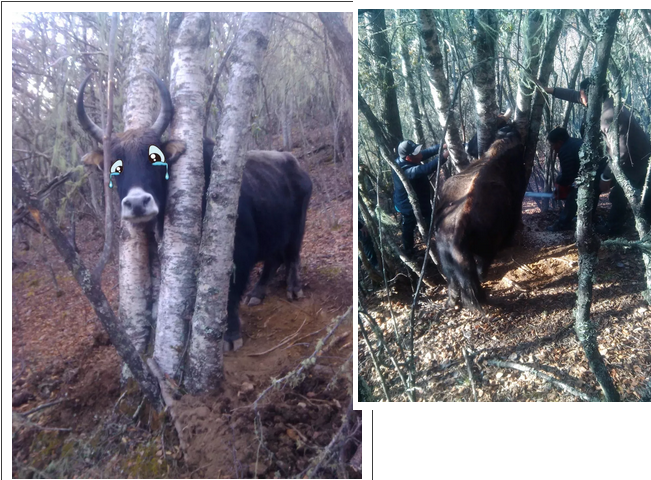 南方電網(wǎng)云南送變電工程公司迪慶工作站巡檢員巡視時,發(fā)現(xiàn)了這只脖子被卡在兩棵樹間不能動彈的牦牛。幾位巡檢員在附近村里找到了牦牛的主人,和村民們攜手,一起鋸斷樹木,把受困的牦牛解救了出來。