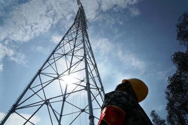 500千伏獅洋至桂山站解口入500千伏文山站輸電線路工程,施工安全人員正注視塔頂工作情況