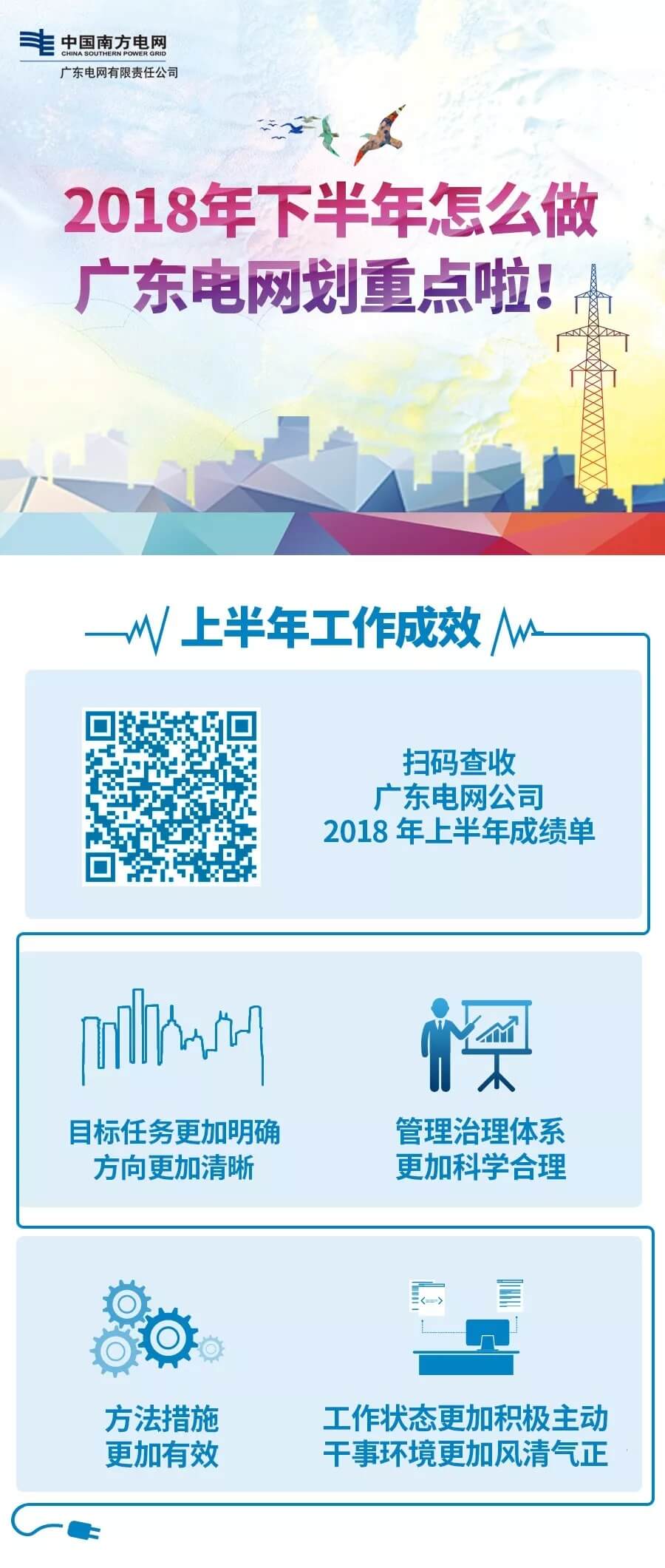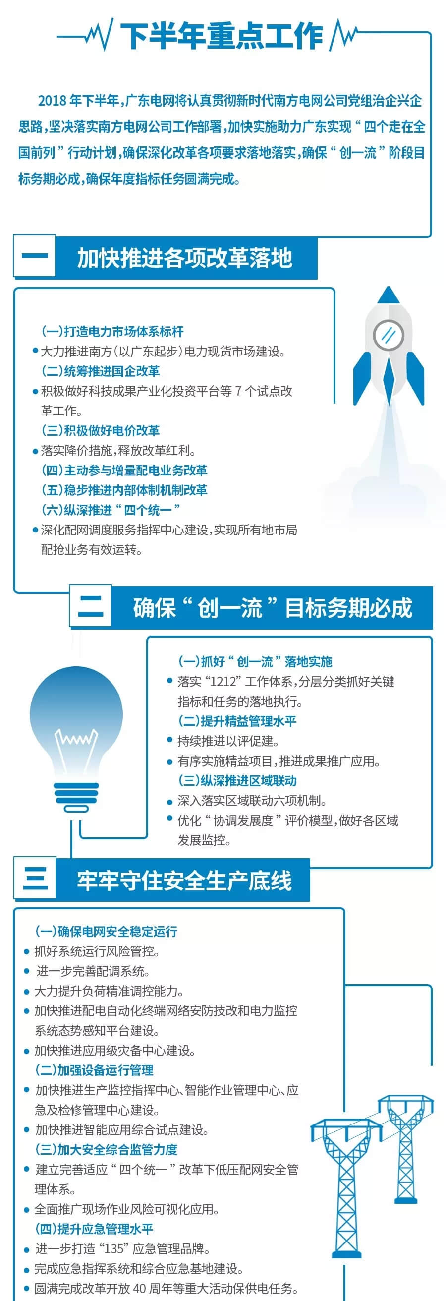 2018年下半年怎么做,廣東電網(wǎng)劃重點(diǎn)啦!一是加快推進(jìn)各項(xiàng)改革落地;二是確保創(chuàng)一流目標(biāo)務(wù)期必成;三是牢牢守住安全生產(chǎn)底線;四是持續(xù)優(yōu)化運(yùn)營(yíng)