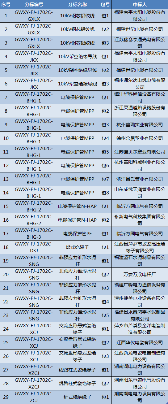 國網(wǎng)福建省電力有限公司2017年第二次配網(wǎng)線路材料協(xié)議庫存招標(biāo)采購項(xiàng)目中標(biāo)結(jié)果公告