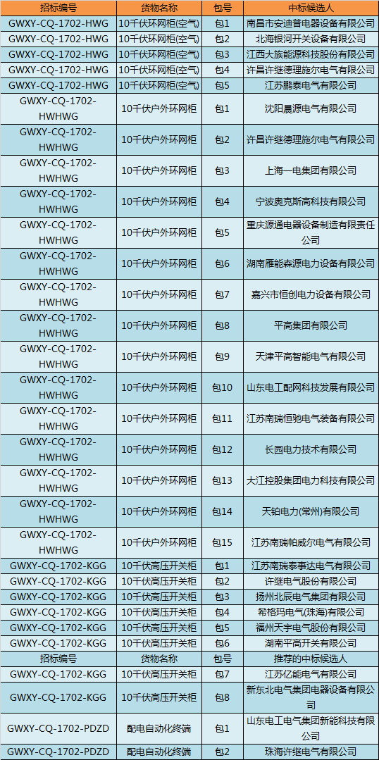 國(guó)網(wǎng)重慶2017年第二次配網(wǎng)設(shè)備/線材協(xié)議庫(kù)存貨物招標(biāo)中標(biāo)候選人