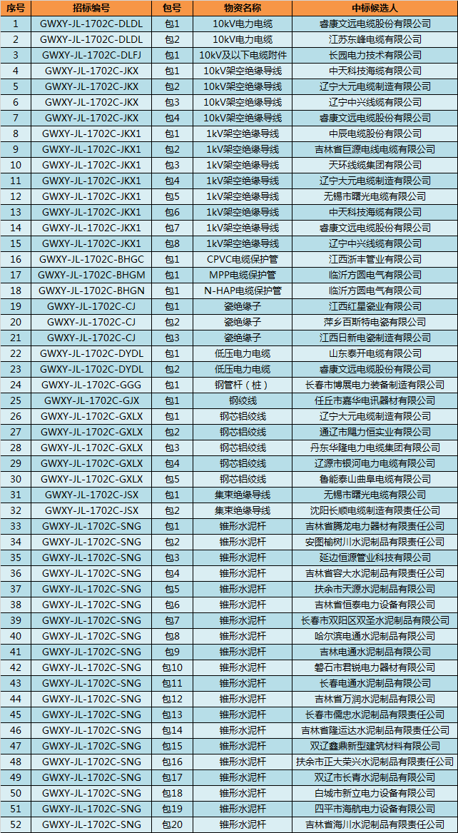 國(guó)網(wǎng)吉林電力2017年第二次配網(wǎng)設(shè)備協(xié)議庫(kù)存貨物招標(biāo)活動(dòng)中標(biāo)候選人結(jié)果:國(guó)網(wǎng)吉林電力2017年第二次配網(wǎng)線路材料協(xié)議庫(kù)存貨物招標(biāo)中標(biāo)候選人結(jié)果: