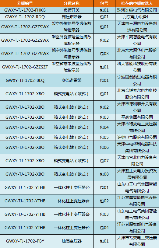 國(guó)網(wǎng)天津電力2017年第二次配網(wǎng)設(shè)備協(xié)議庫(kù)存貨物招標(biāo)活動(dòng)中標(biāo)候選人結(jié)果: