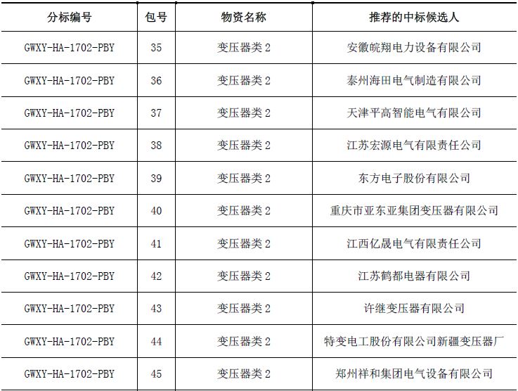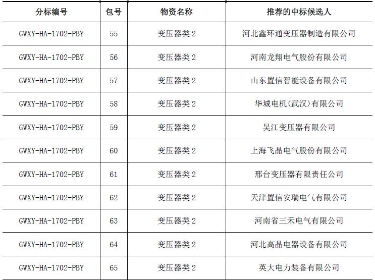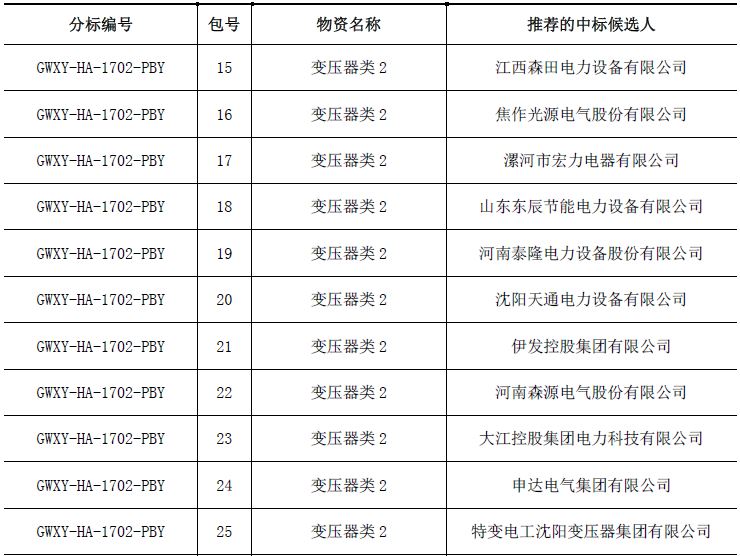 國(guó)網(wǎng)河南省電力公司2017年第二次配網(wǎng)設(shè)備(變壓器類)協(xié)議庫(kù)存招標(biāo)采購(gòu)中標(biāo)結(jié)果公告招標(biāo)編號(hào):GWXY-HA-1702