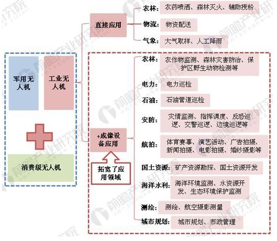 無人機的設計概念最早應用于軍工領域,由于軍工設備具有較強的技術(shù)保密和行業(yè)壟斷性質(zhì),民營企業(yè)和資本很難獲得準入。隨著世界范圍內(nèi)軍民融合戰(zhàn)略的實施和推進,近幾年無人機技術(shù)在民用領域的應用獲得長足發(fā)展。根據(jù)無人機應用領域,可分為消費級無人機和工業(yè)級無人機;消費級無人機主要應用于個人航拍,工業(yè)級無人機廣泛應用于農(nóng)業(yè)植保、國土勘測、安防和電力巡檢等領域。