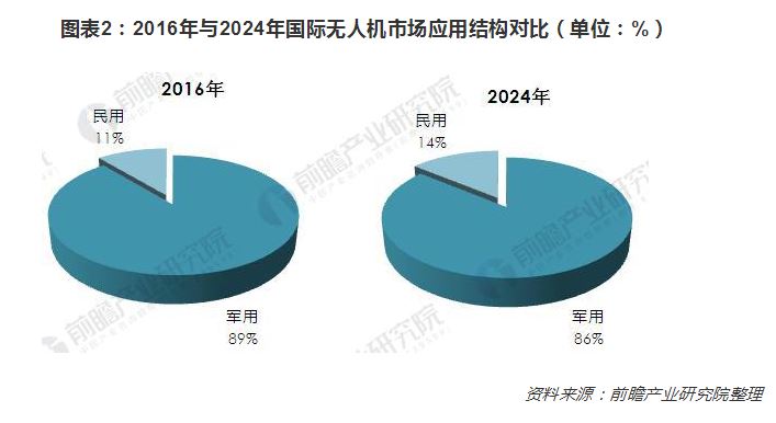 2016年,在全球無人機應用中,民用占比約為11%,軍用占比為89%;隨著民用市場的擴張,預計到2024年,民用占比將提升至14%左右。