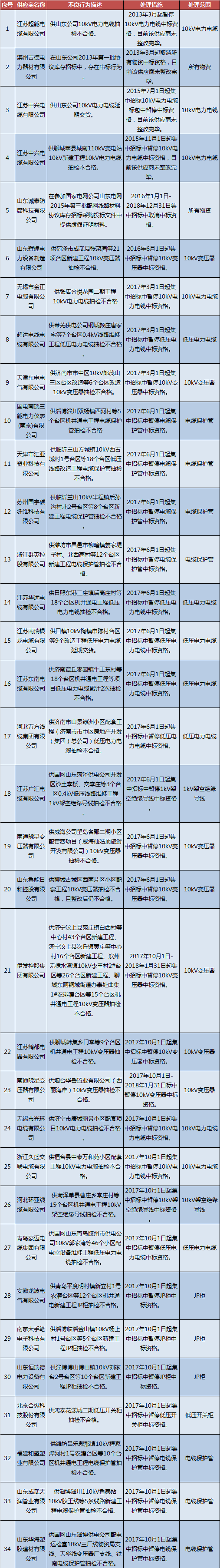 為促進(jìn)供應(yīng)商誠(chéng)信履約,保證產(chǎn)品質(zhì)量,確保電網(wǎng)建設(shè)順利進(jìn)行及安全可靠供電,依據(jù)《國(guó)家電網(wǎng)公司供應(yīng)商不良行為處理管理細(xì)則》的有關(guān)規(guī)定,對(duì)出現(xiàn)產(chǎn)品質(zhì)量問(wèn)題、履約不誠(chéng)信等問(wèn)題的供應(yīng)商進(jìn)行了處理。具體處理情況如下: