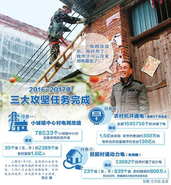 2017年12月,小城鎮(zhèn)中心村農(nóng)網(wǎng)改造升級(jí)任務(wù)全面完成,合計(jì)為78533個(gè)小城鎮(zhèn)中心村實(shí)施農(nóng)網(wǎng)改造升級(jí),涉及30個(gè)?。▍^(qū)、市)的2389個(gè)縣,涉及農(nóng)村居民1.6億人;