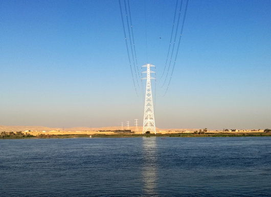 埃及EETC500千伏主干網(wǎng)升級改造輸電工程。圖為輸電線路跨越尼羅河,國家電網(wǎng)公司按照建設(shè)“一帶一路”標桿工程開展項目履約。